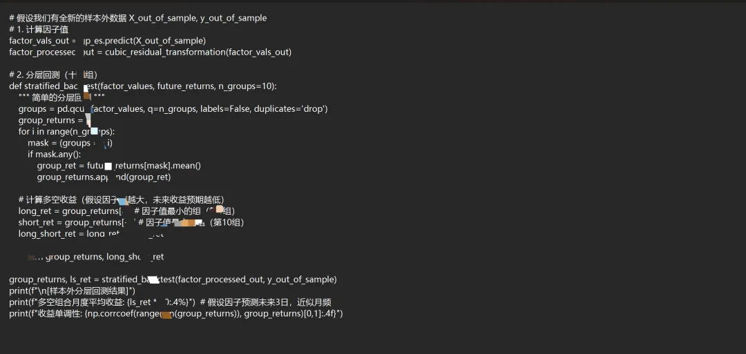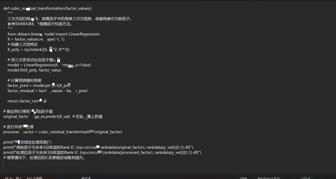 非线性因子处理:我们实现了cubic_residual_transformation函数。它将算法挖掘出的复杂因子(如包含max, mul, sub的表达式)进行数学变换,剥离其简单的三次方趋势,可能暴露出更稳健的Alpha信号。这是将“机器发现”的因子适配到传统线性多因子模型的关键一步。