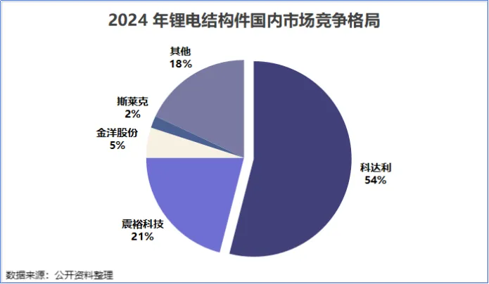 绑定宁德时代,让震裕科技在锂电结构件行业的市占率快速提升。2024年,公司在国内锂电结构件的市占率达到了21%,仅次于科达利。