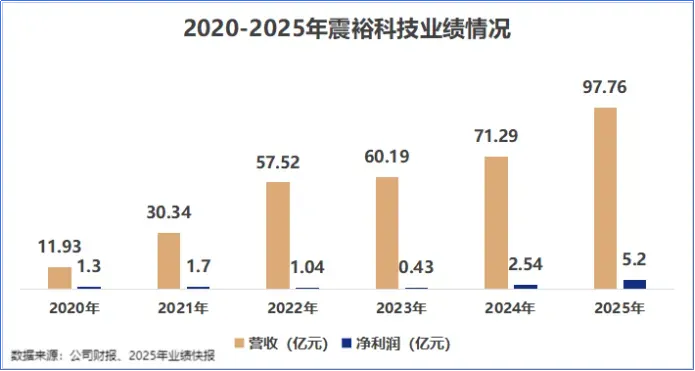 根据业绩快报,2025年,公司实现营收97.76亿元,同比增长37.13%;实现净利润5.2亿元,同比增长104.93%。