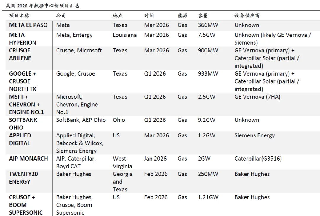2026年一季度,美国市场新公布或有更新进展的AI数据中心项目,总装机容量超过20GW,其中Meta Hyperion园区规划7.5GW、软银俄亥俄州项目规划9.2GW、微软西得克萨斯州项目初始规模2.5GW,燃气发电成为这些项目的核心能源来源。