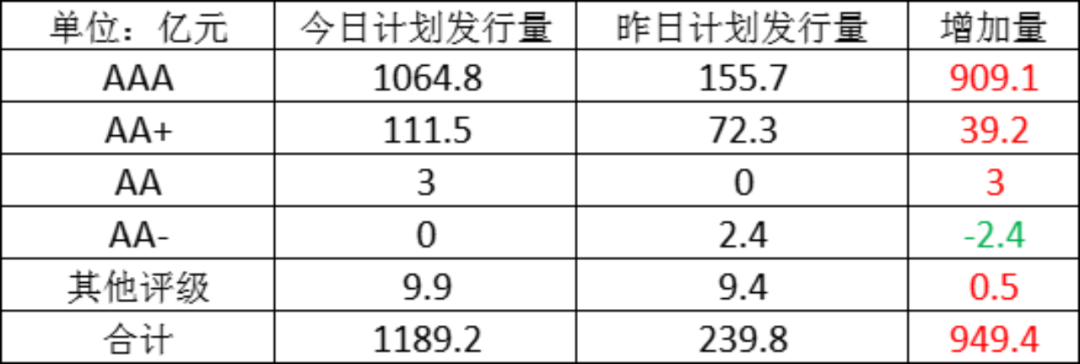 今日存单计划发行量规1189.2亿元,较上一工作日计划发行量大幅增加,增加了949.4亿元。