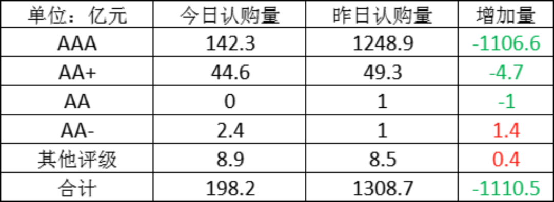 今日存单认购量规模198.2亿元,较上一工作日认购量大幅减少,减少了1110.5亿元。