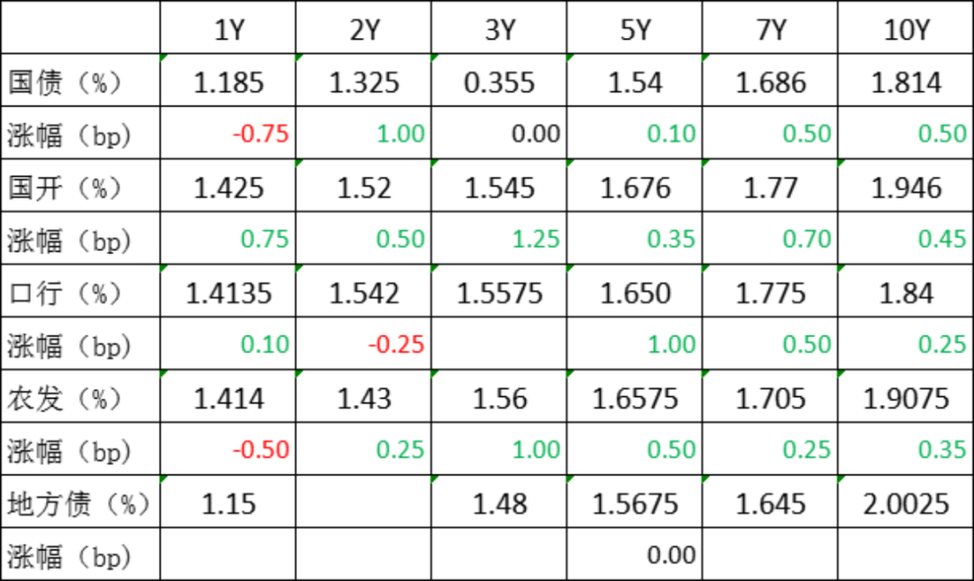 截止17:10,利率债二级市场中,利率成交价格总体呈上涨趋势,其中上涨程度较大的有2年期国债,收益率上涨1bp,报1.325%;3年期国开债,收益率上涨1.25bp,报1.545%;5年期口行债,收益率上涨1bp,报1.65%,3年期农发债,收益率上涨1bp,报1.56%。