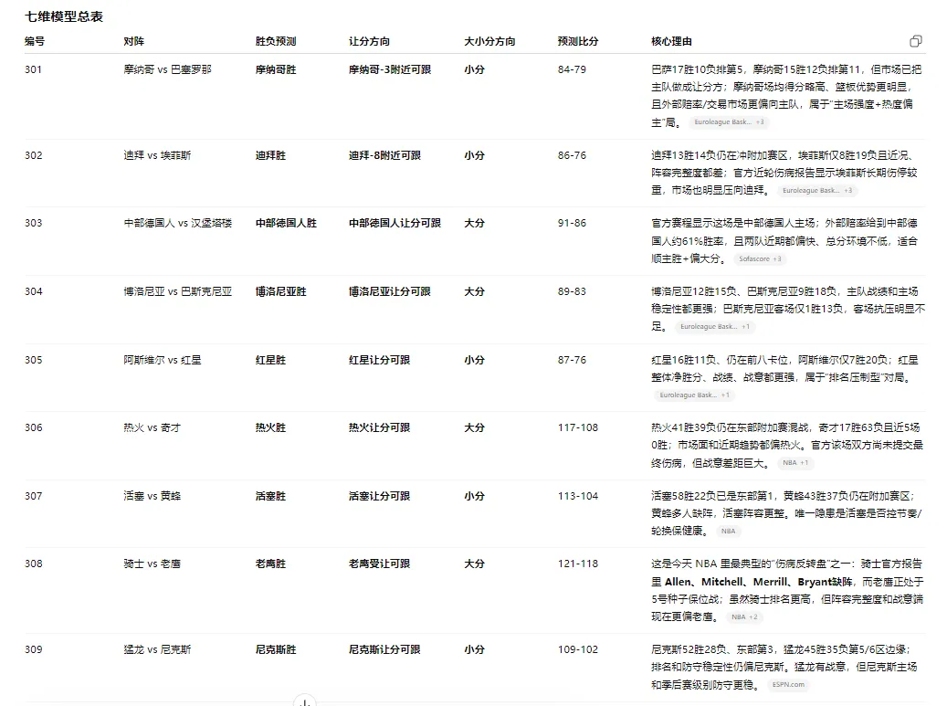欧篮联四场里,最清晰的结构是:红星 > 阿斯维尔:排名、净胜分、战意三项都压制。迪拜 > 埃菲斯:埃菲斯赛季整体崩盘,且伤停持续,市场热度也明显向迪拜集中。摩纳哥 vs 巴萨:这是欧篮联里最难的一场,实力接近,但主场、篮板、市场热度都更偏摩纳哥,所以我站摩纳哥小胜+小分。