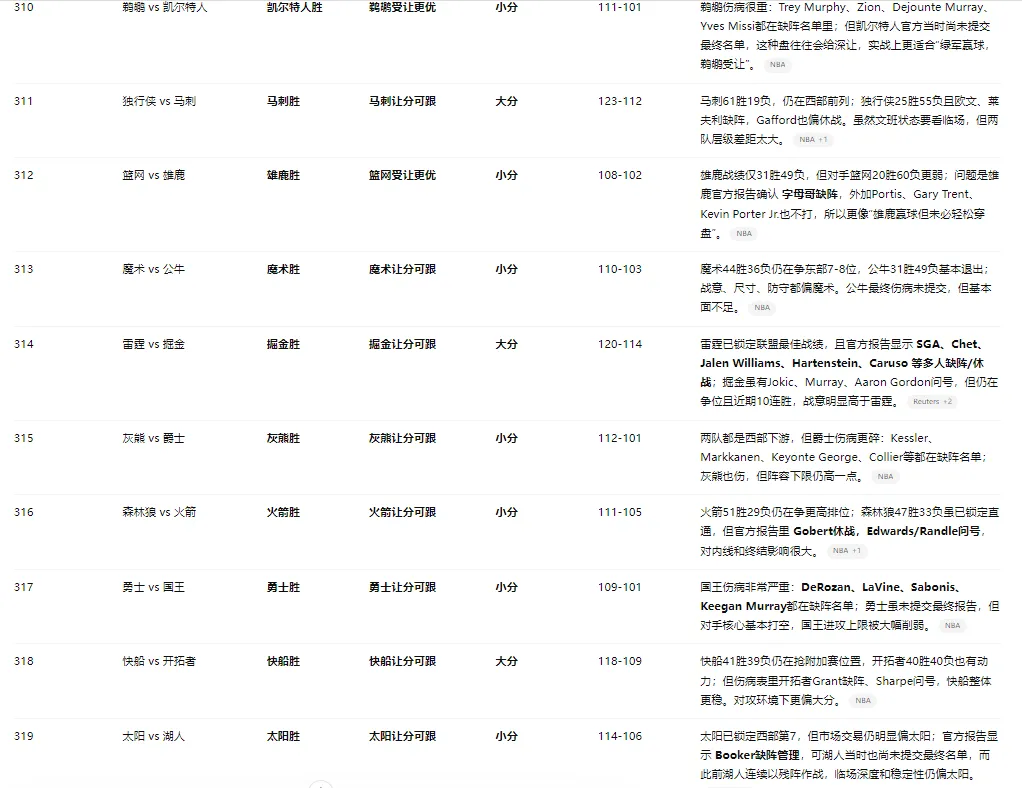 几场典型伤病反转:骑士 vs 老鹰:骑士少 Mitchell + Allen,基本从“实力强队”变成“残阵高位队”。勇士 vs 国王:国王缺 DeRozan、LaVine、Sabonis、Keegan Murray,核心框架几乎被拆空。雄鹿 vs 篮网:字母哥不打,使得雄鹿赢面还在,但穿盘确定性明显下降。森林狼 vs 火箭:Gobert休战,Edwards/Randle问号,森林狼攻防两端都受损。