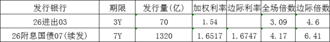 今日中国进出口银行发行3年政策性金融债,发行量70亿元,发行利率1.54%,投标倍数3.09倍,边际倍数4.6倍;财政部发行7年政策性金融债,发行量1320亿元,发行利率1.6747%,投标倍数4.17倍,边际倍数6.41倍。