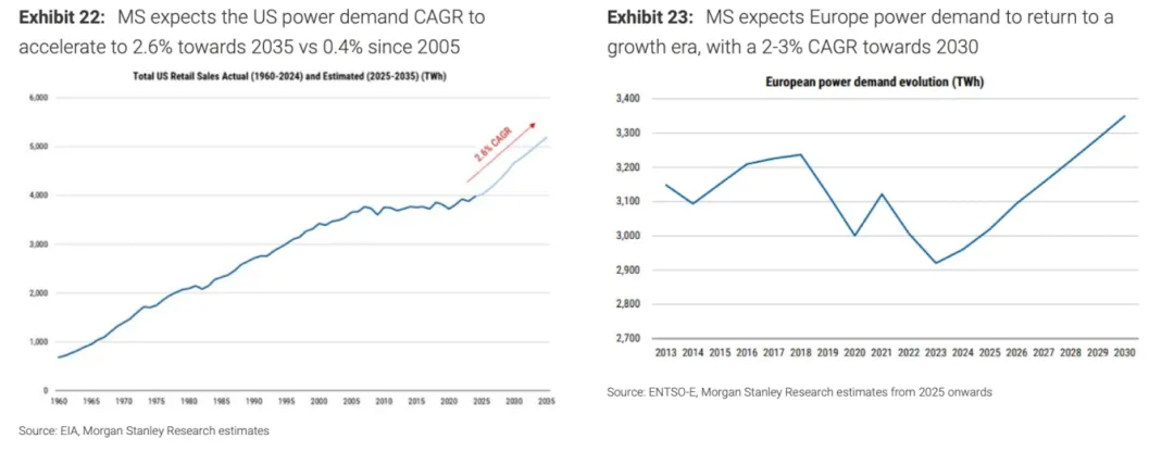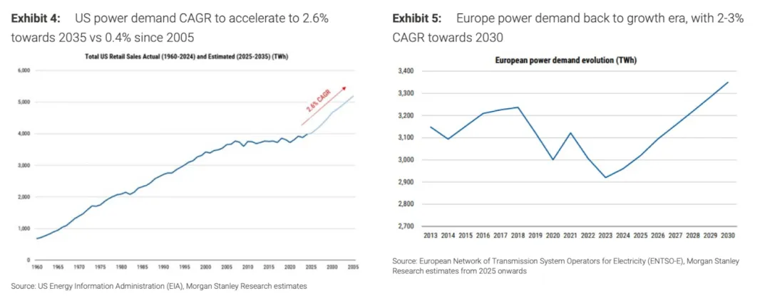 我们认为电力与电网设备的上行周期将持续至2030年之后,电力需求增长与电网升级是核心驱动力。当前全球多地正面临日益严峻的电力约束与电网不稳定性问题。我们的全球同事预计,美国和欧洲到2030年或更远期的电力需求复合年增长率(CAGR)将达到2%–3%,而过去5–10年则基本停滞甚至下滑。