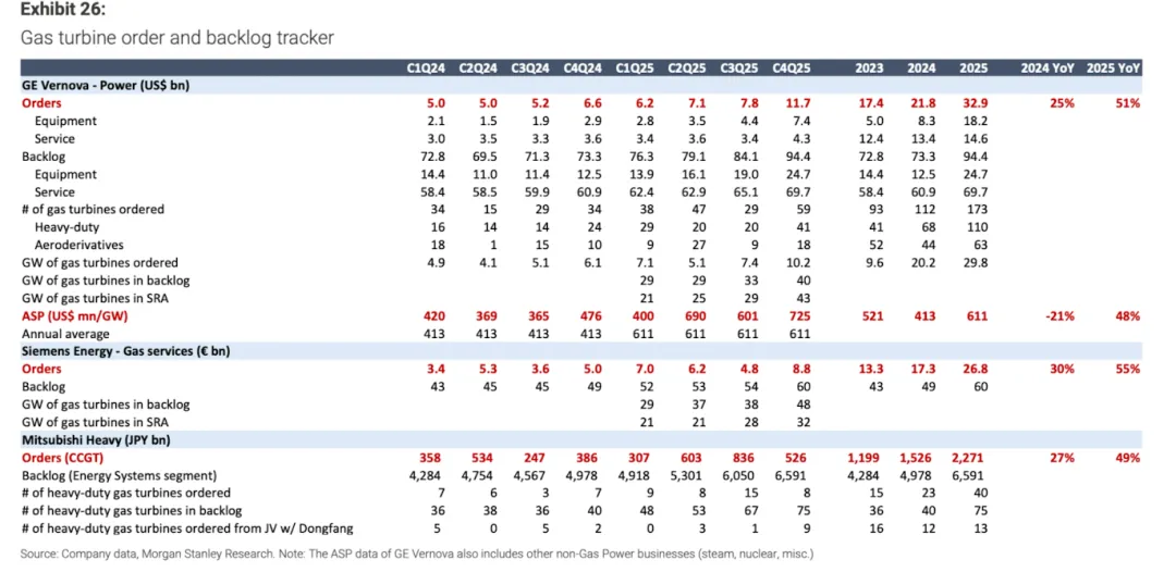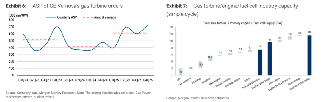 燃气轮机ASP也在上升。GE Vernova(GEV)2025年燃气轮机订单ASP同比上涨48%,达6.11亿美元/GW。在其2025财年分析师简报会上,CEO提到“槽位预留协议”的ASP比现有积压订单高出10%–20%,表明价格上涨趋势将持续。