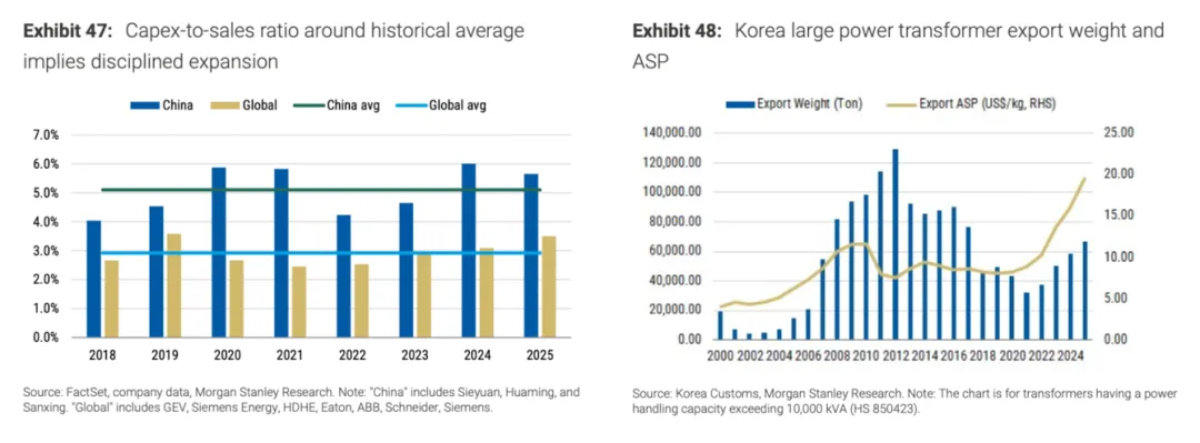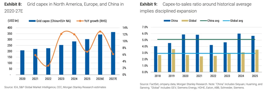 与燃气轮机情况类似,电网设备供应链同样存在紧张局面,而全球设备制造商的新增资本开支仍保持纪律性——资本开支占销售额的比例基本稳定。这有助于维持电网设备的有利定价环境,并使具备充足产能和更短交货周期的中国出口企业受益。