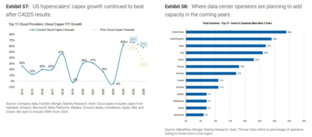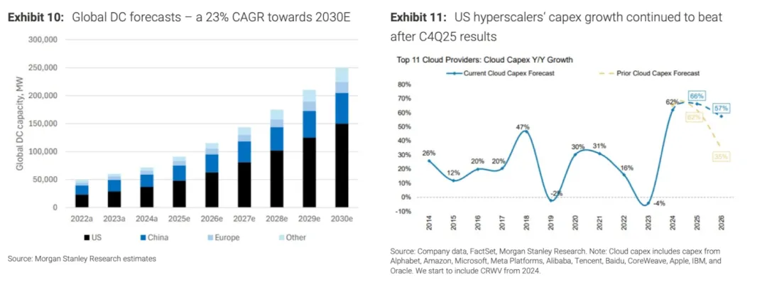 我们的美国科技团队预计,在2025年第四季度财报发布后,全球超大规模云服务商2026年资本开支将同比增长57%,远高于此前预期的35%,表明全球AI资本开支仍在持续超预期。