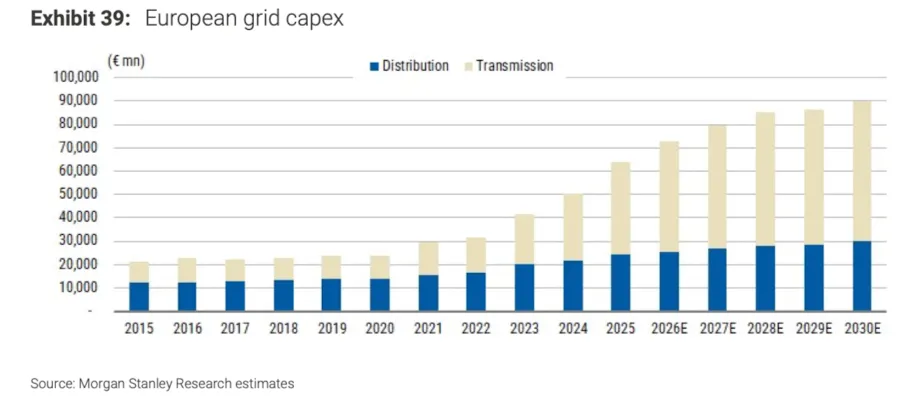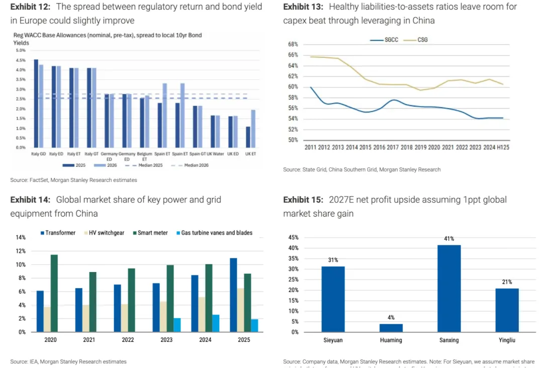 基于摩根士丹利欧洲与中国公用事业团队的估算以及标普全球(S&P Global)的预测,我们预计2025–2027年期间,中国/欧洲/美国的电网资本开支CAGR将分别维持在9%/12%/8.5%,高于IEA统计的2020–2025年全球6%–7%的CAGR。中东地区则有望维持高于同行的增长水平,例如沙特能源公司(Saudi Energy)2021–2025年电网资本开支CAGR达38%,其2026年资本开支指引较2025年进一步增长40%。