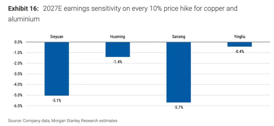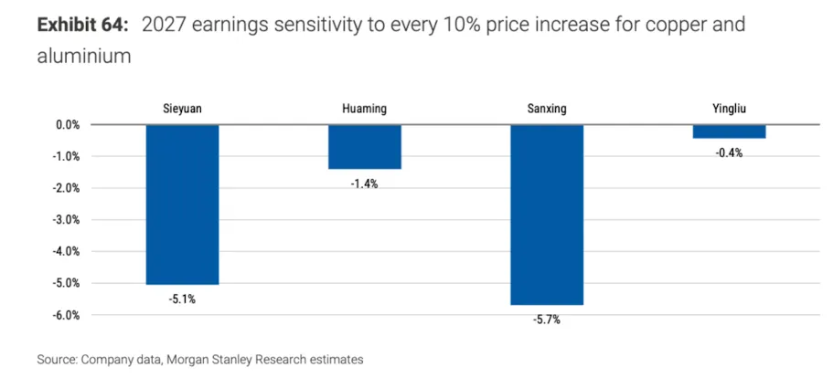 关于利润率,我们的敏感性分析显示:若铜和铝价格同时上涨10%,在海外订单具备成本转嫁机制的前提下(鉴于当前全球设备供应紧张),2027年EPS最多仅面临0%–6%的下行压力。若仅铝价上涨,则EPS影响将进一步收窄至0%–2%。该测算基于90%的成本通胀可通过海外订单转嫁的假设。