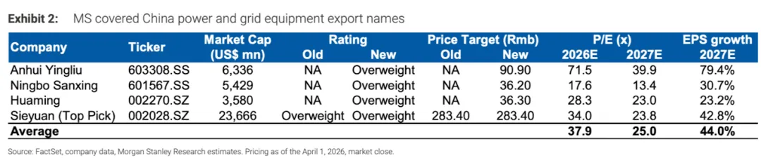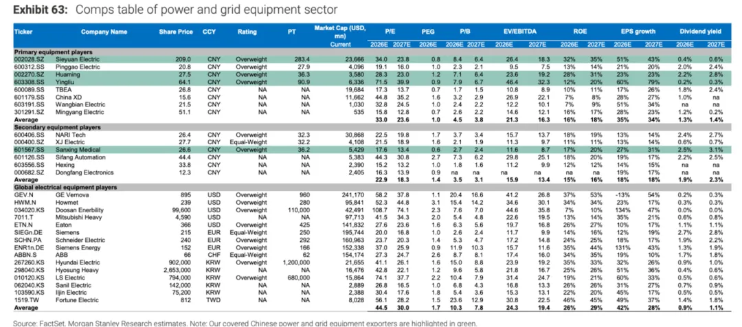 全球比较:全球电力与电网设备板块目前2026年预期市盈率(P/E)为45倍,对应2027年28%的EPS增长,PEG(市盈率相对盈利增长比率)为1.7倍。我们看好的中国电力与电网设备出口企业平均P/E为38倍,对应2027年44%的平均EPS增长——相比全球同行,P/E折价15%,PEG折价超45%。我们认为,随着中国电力与电网设备全球渗透率提升,这一估值折价应逐步收窄。