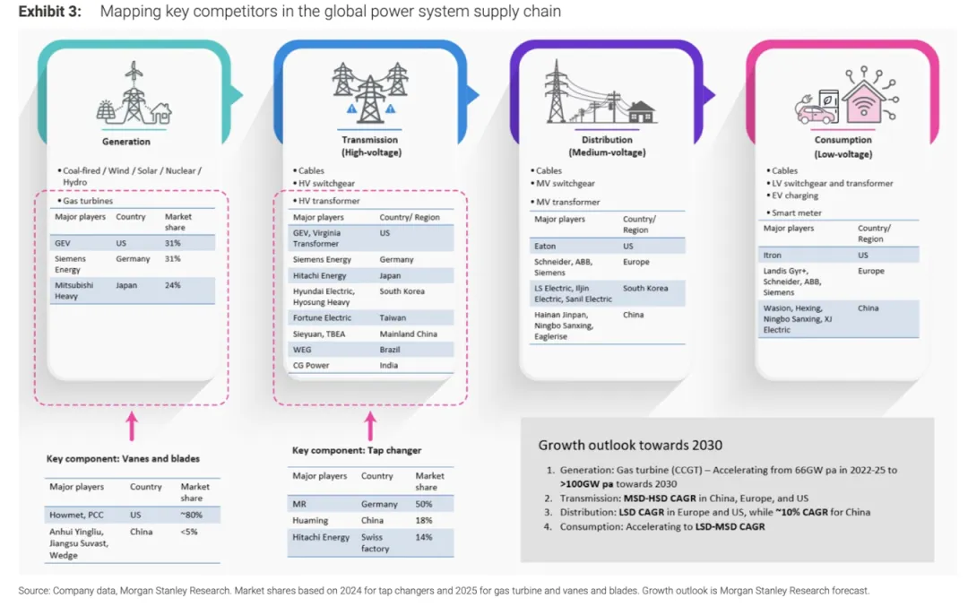 今天这篇文章则是对能源独立主题投资机会的科普,内容来自大摩的最新研报《全球超级周期持续,在中国电力设备股寻找下一波上涨动力》。报告指出,全球电力需求正经历结构性拐点,AI数据中心爆发、能源转型加速及电网老化共同催生一场持续至2030年以后的电力与电网设备超级周期。中国出口企业凭借产能优势、技术成熟和高性价比,正快速切入全球供应链,在燃气轮机核心部件、变压器、高压开关等领域迎来份额跃升机遇。尽管相关公司股价自2024年以来大幅上涨,但扎实的盈利增长、显著的全球估值折价以及潜在的市场份额非线性突破,仍为板块提供强劲上行动能。本报告深入剖析周期阶段、上行催化剂与估值逻辑,揭示被市场低估的长期投资价值。优选标的包括: 应流股份、思源电气、三星医疗和华明装备。