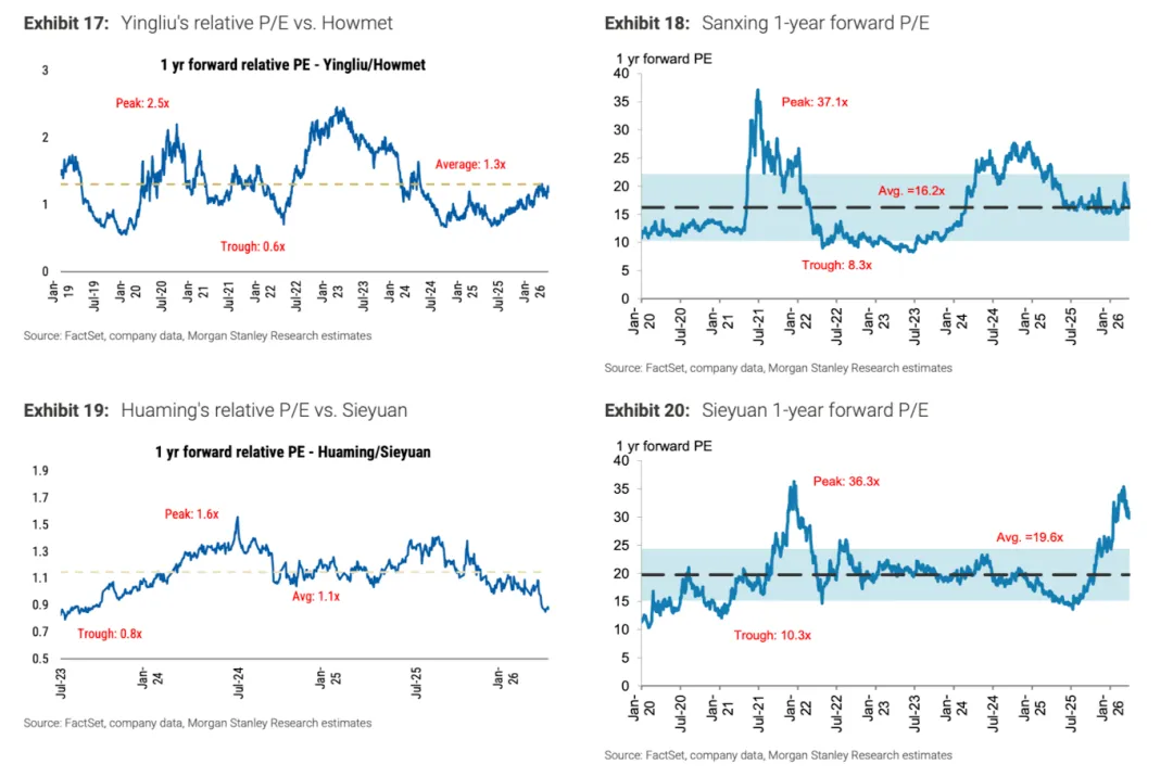 基于对全球市场份额提升和利润率扩张更乐观的判断,我们对四家公司2027年EPS预测较市场一致预期高出4%–16%。这四家公司2026年预期市盈率(P/E)平均为38倍,PEG(市盈率相对盈利增长比率)为0.9倍,对应2027年EPS增速44%,仍低于全球同行平均的45倍P/E和1.7倍PEG。
