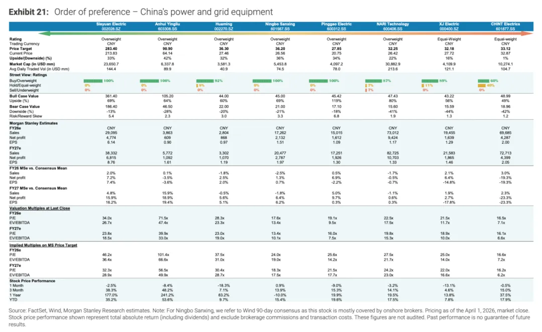 另外,我们在2025年3月20日发布的亚太洞察报告《中国电力系统》中已明确偏好设备环节而非下游运营商。本报告聚焦设备领域,我们进一步将出口导向型企业排在纯内需型企业之前。我们认为,出口企业凭借全球市场份额提升和利润率扩张潜力,能够实现更强的增长曲线、更高的盈利上行可能性以及更清晰的盈利可见性。我们最看好的标的为应流与思源电气(首推),二者分别是全球燃气轮机与大型电力变压器短缺的核心受益者。