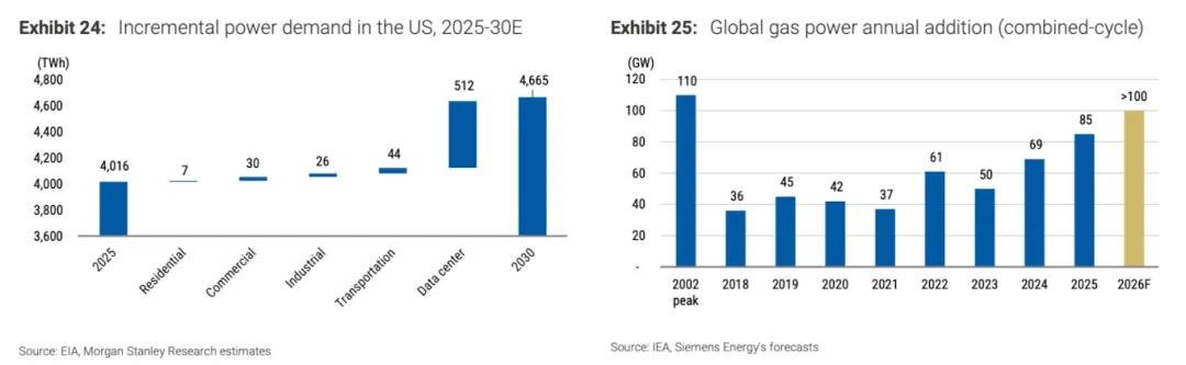 我们认为数据中心是推动电力需求加速增长的关键驱动力。据摩根士丹利研究估算,在美国,2025–2030年新增电力需求中约80%来自数据中心。为支撑AI数据中心建设热潮,必须部署可靠的基荷发电能力,如燃气轮机。根据全球前两大燃气轮机制造商西门子能源与GE Vernova的预测,全球燃气轮机年均需求将从2022–2025年的66GW,提升至未来十年超过100GW,并伴随更高的平均售价(ASP)。