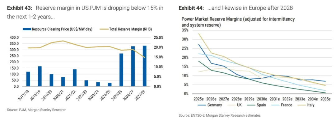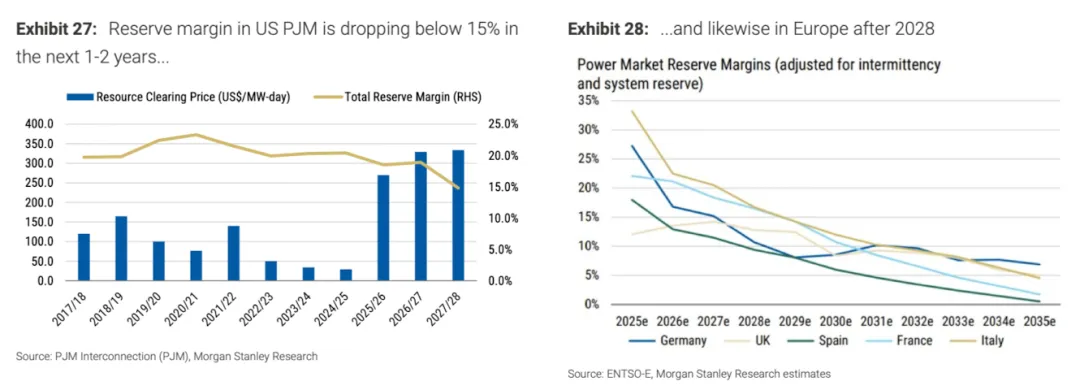 历史上,全球燃气轮机需求在2000年代初达到峰值,年均装机约110GW。我们认为本轮上行周期可能“更高且更持久”。关键差异在于电力需求增长与备用容量裕度(reserve margin)。2000年代初,美国电力需求增速不足以消化新建燃气电厂,导致备用裕度持续攀升——据北美电力可靠性公司(NERC)数据,从1999年的9%升至2002年的27%。而如今,我们正面临加速的电力需求增长,备用裕度却快速下降。PJM基础剩余拍卖(Base Residual Auction)结果显示,备用裕度已从2020年代初的20%–25%降至目前不足20%,并可能在2027–2028年跌破15%。我们的欧洲分析师也预计主要欧洲国家将出现类似下行趋势。