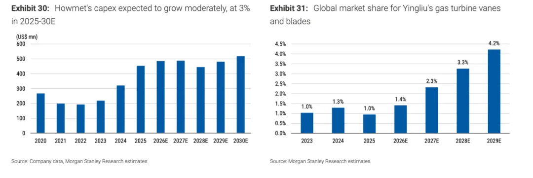 综合强劲的订单流入、持续上涨的价格,以及需求超预期的高概率(考虑到AI超大规模企业仍在上调资本开支计划),我们对2030年前燃气轮机供应链持乐观看法。我们认为新覆盖标的安徽应流(603308.SH)在此主题中占据最佳位置。作为中国最大的燃气轮机动叶与静叶供应商,应流直接与美国的豪美特(Howmet)和PCC竞争。西门子能源、GEV和安萨尔多(Ansaldo)等燃气轮机整机厂均为应流客户。