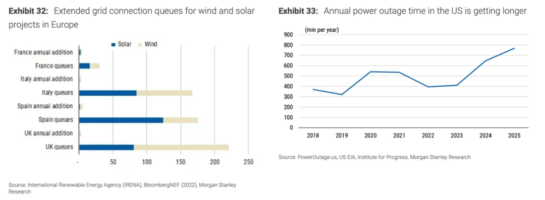 上述电力需求与电网资本开支计划虽已强劲且激进,但我们认为当前执行力度仍显不足,尤其在美国和欧洲,亟需进一步加速。在我们看来,需求与执行之间的差距体现在三个方面:1)项目审批与建设耗时过长;2)停电严重性已难以被视作偶发事件;3)系统备用容量裕度持续收紧。
