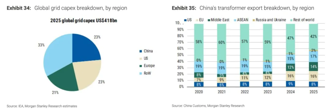 以变压器为例——作为电网系统中最关键的设备,我们对其出口目的地变化进行了剖析。我们发现,自2020年以来,中国对美出口占比保持稳定,而欧盟和中东正成为中国越来越重要的贸易伙伴:2025年,这两地合计占中国变压器出口的30%,约为美国贡献的4倍。这三个地区通常被视为高利润率市场,2025年合计占中国变压器出口的40%,远高于2020年的23%。我们认为这一趋势将持续,因为我们看到这些地区电网资本开支增长最为强劲,且融资约束相对较小。