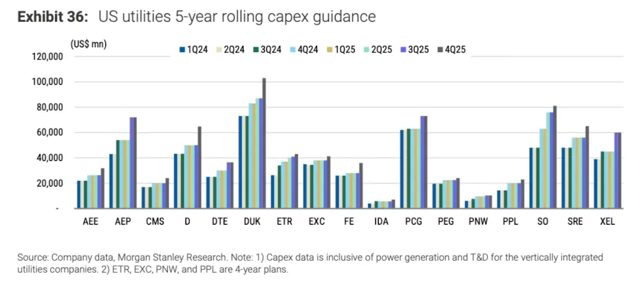 美国的电力需求背景已发生实质性变化。我们的美国公用事业团队预计,2025–2030年电力需求CAGR为3%,2030–2035年为2.2%,而2005年以来仅为0.4%。这一转变意义重大——过去20年美国电网规划基于近乎零增长的假设,如今这一前提已被打破。