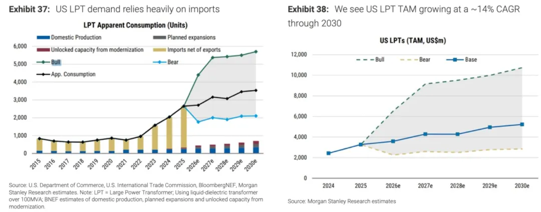 摩根士丹利全球公用事业与基础设施分析师预测,到2030年,美国大型电力变压器(LPT)的TAM将以14%的CAGR增长。在乐观情景下,2030年TAM规模可达基准情景的两倍以上,由更强的需求和更激进的平均售价(ASP)共同驱动。