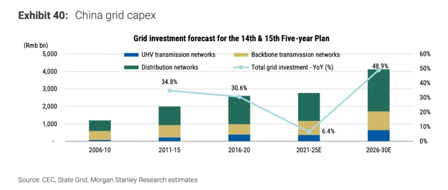 中国在国内电网投资方面已领先于大多数海外市场,这一点至关重要——它为中国供应商在出口需求全面放量前提供了规模效应、示范项目和制造产能利用率。国家电网计划在2026–2030年投资4万亿元人民币,较此前五年期已处于高位的基数再提升约40%。