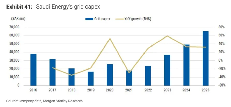 中东在绝对电网投资额上仍小于中国、美国或欧洲,但增速极高。沙特能源公司表示,截至2024年底,已投运10座变电站,并新增约148.5公里输电线路,用于接入6.6吉瓦可再生能源。此外,另有24座变电站和约4327.5公里输电线路正在建设中,预计到2027年将接入约34.4吉瓦可再生能源。这意味着未来可再生能源并网规模(按吉瓦计)是2024年已并网规模的五倍以上,凸显电网需求正在快速扩张。沙特能源公司2021–2025年电网资本开支CAGR达38%,2026年资本开支指引较2025年再增40%。