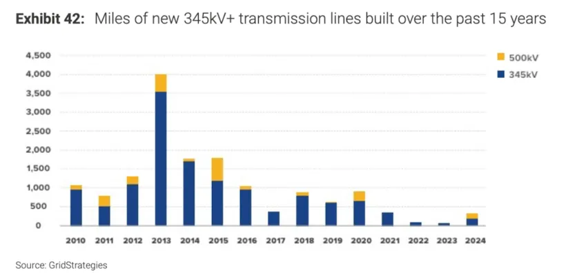 美国能源部(DOE)预计,为强化电网系统,到2035年美国输电网络年均需新增5000–8100英里线路,但过去15年实际年均完工不足1500英里——表明美国电网建设速度过慢。