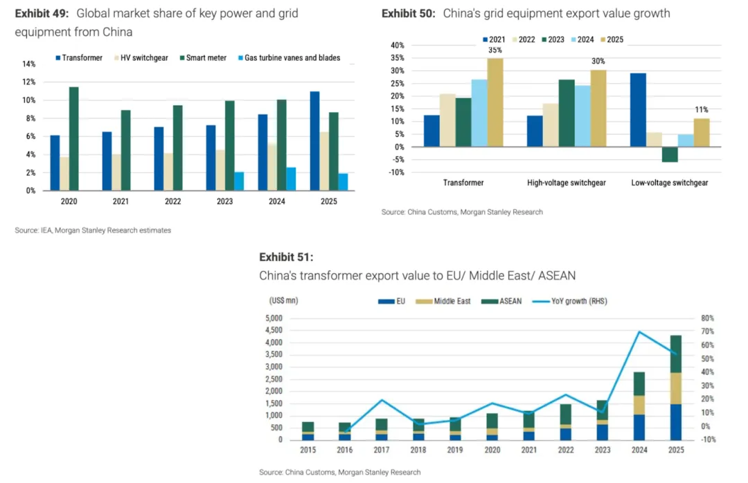 我们认为应对全球电力约束和电网瓶颈的一个切实可行的答案很简单:从中国采购更多设备。首先,大多数电力与电网设备属于非数据敏感型重资产,意味着较低的国家安全风险。此外,在变压器、开关设备及相关电网组件领域,中国拥有全球最广泛的制造基础——在全球供应紧张的背景下,这是独一无二的优势。然而,目前中国在核心电力与电网设备领域的渗透率仍然较低,约为10%或更低。这远低于太阳能组件或动力电池(2025年全球市场份额分别达80%和70%),意味着出口增长跑道可能比市场预期更长。