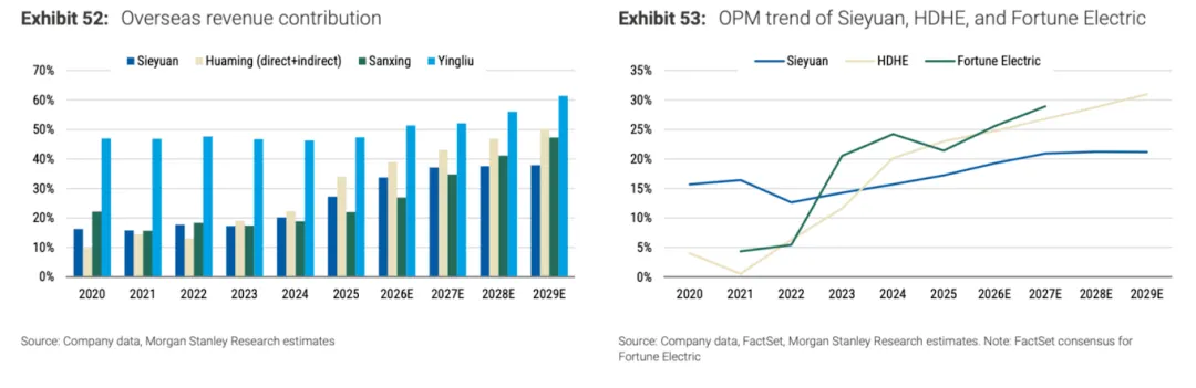 我们所覆盖的中国电力与电网设备出口企业正呈现出加速海外扩张的趋势。截至2025年,这些公司的海外收入占比平均已达33%,高于2020年的24%;且海外业务毛利率更高——历史数据显示,其海外毛利率(GPM)通常比国内高3–12个百分点。在新订单方面,海外市场提供了更强的增长动能。例如,思源电气(Sieyuan)2020–2025年海外订单CAGR达50%,而同期国内订单仅增长21%。因此,我们认为这些出口企业在未来五年有望实现增长与利润率的双重提升。