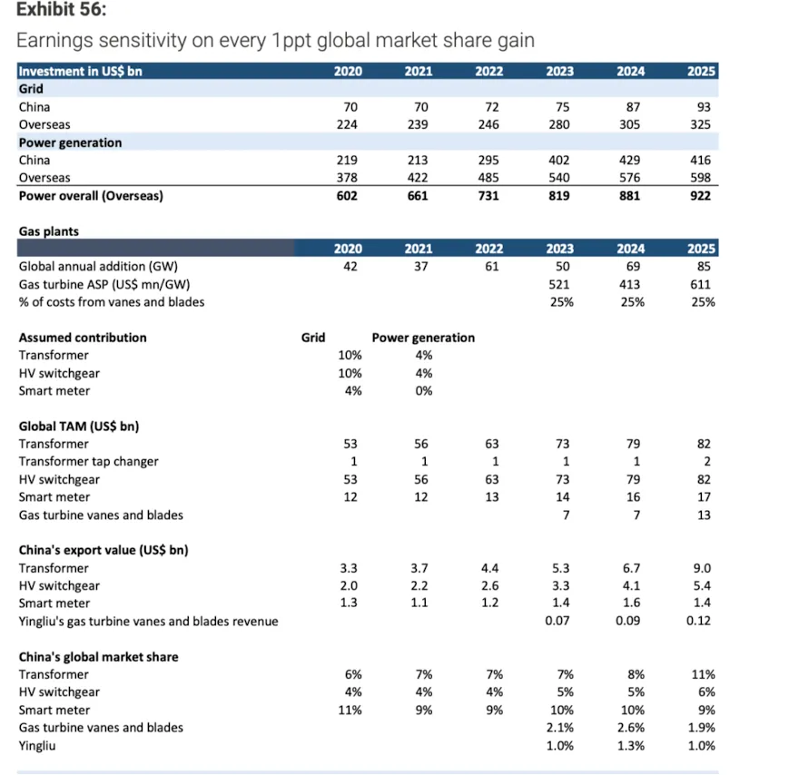 我们从两个维度预见中国电力与电网设备出口企业的每股收益(EPS)存在上行空间:全球市场份额提升 和 可服务市场(TAM)扩大。