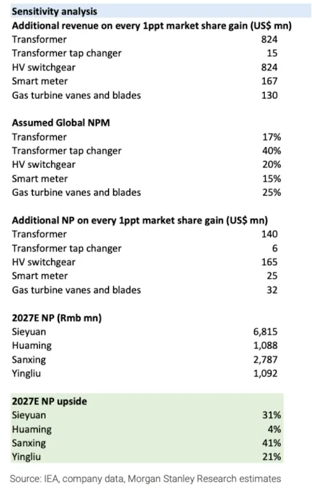 据我们估算,目前中国企业在燃气轮机动叶与静叶、变压器、高压开关设备领域的全球市场份额仍较低,分别为2%、6%和11%,远低于其他出口导向型优势领域(如2025年动力电池和光伏组件的全球份额分别达70%和80%)。我们的敏感性分析显示,每提升1个百分点(1ppt)的全球市场份额,可为中国变压器/高压开关/燃气轮机动静叶制造商分别带来8.24亿/8.24亿/1.3亿美元的收入潜力。这或将推动思源电气(Sieyuan)、华明(Huaming)、三星(Sanxing)和应流(Yingliu)2027年EPS分别提升31%、4%、41%和21%。