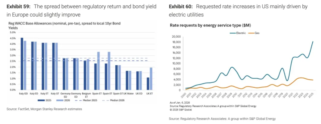 我们认为本轮资本开支周期具备投资价值的关键原因之一是监管框架正变得不那么严苛。欧洲在名义回报率方面的改善最为明显。在西班牙,2026–2031年输电、配电及系统运营的财务报酬率已设定为6.58%,高于上一监管周期的5.58%,提升了100个基点。在英国,Ofgem发布的RIIO-3最终决定为2026–2031年设定了5.70%的股权成本,反映了更高的利率环境。展望未来,我们预计其他司法管辖区也将改善允许回报率,例如德国的相关审查仍在进行中。我们认为这些有利结果将支撑欧洲电网资本开支加速。