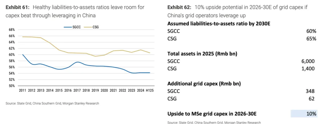 我们认为国内电网公司资产负债表仍有充足空间。自2011年以来,国家电网(SGCC)和南方电网(CSG)的资产负债率持续下降,为若其采取更激进杠杆策略提供了资本开支上行空间。假设到2030年底,SGCC资产负债率升至60%,CSG升至65%(均未超过国资委70%的要求),则额外电网投资能力可达4100亿元人民币,相当于我们预测的2026–2030年中国电网资本开支的10%上行空间。