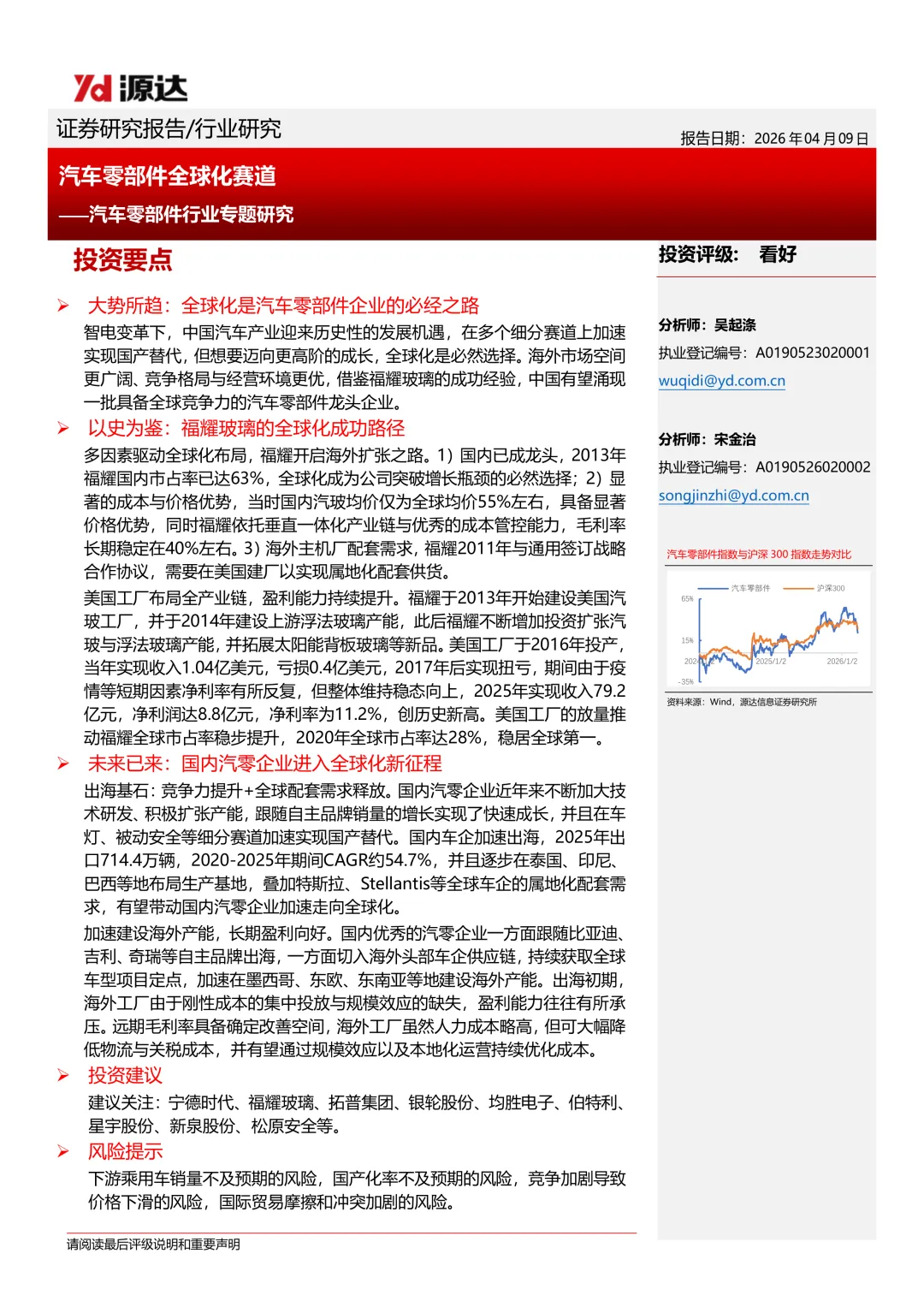 材料给出的关注标的包括:宁德时代、福耀玻璃、拓普集团、银轮股份、均胜电子、伯特利、星宇股份、新泉股份、松原安全。