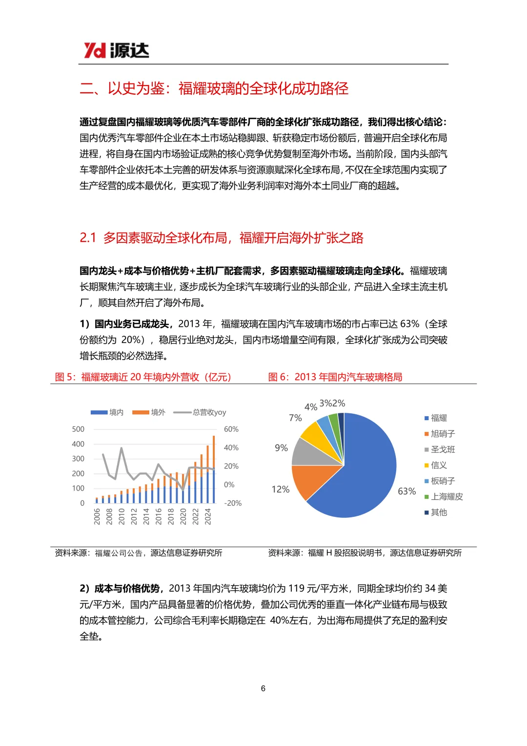 第一,国内已经是龙头。2013 年福耀国内汽玻市占率 63%,全球份额约 20%,国内增量空间有限,出海是必然。