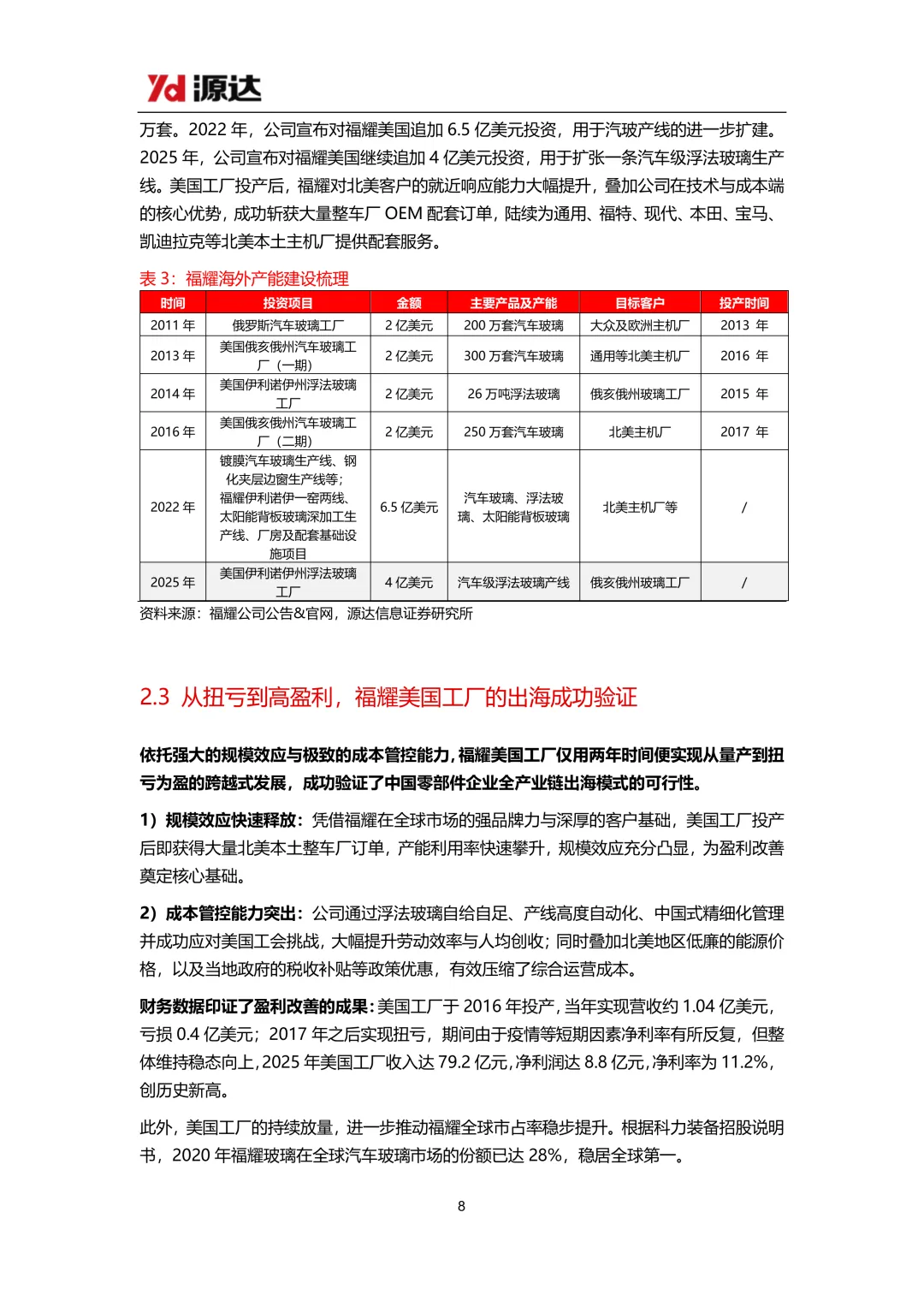 第三,有主机厂拉着走。2011 年福耀与通用签署战略合作,需要在美国建厂实现属地化配套供货。需求把路铺好,风险就小一截。