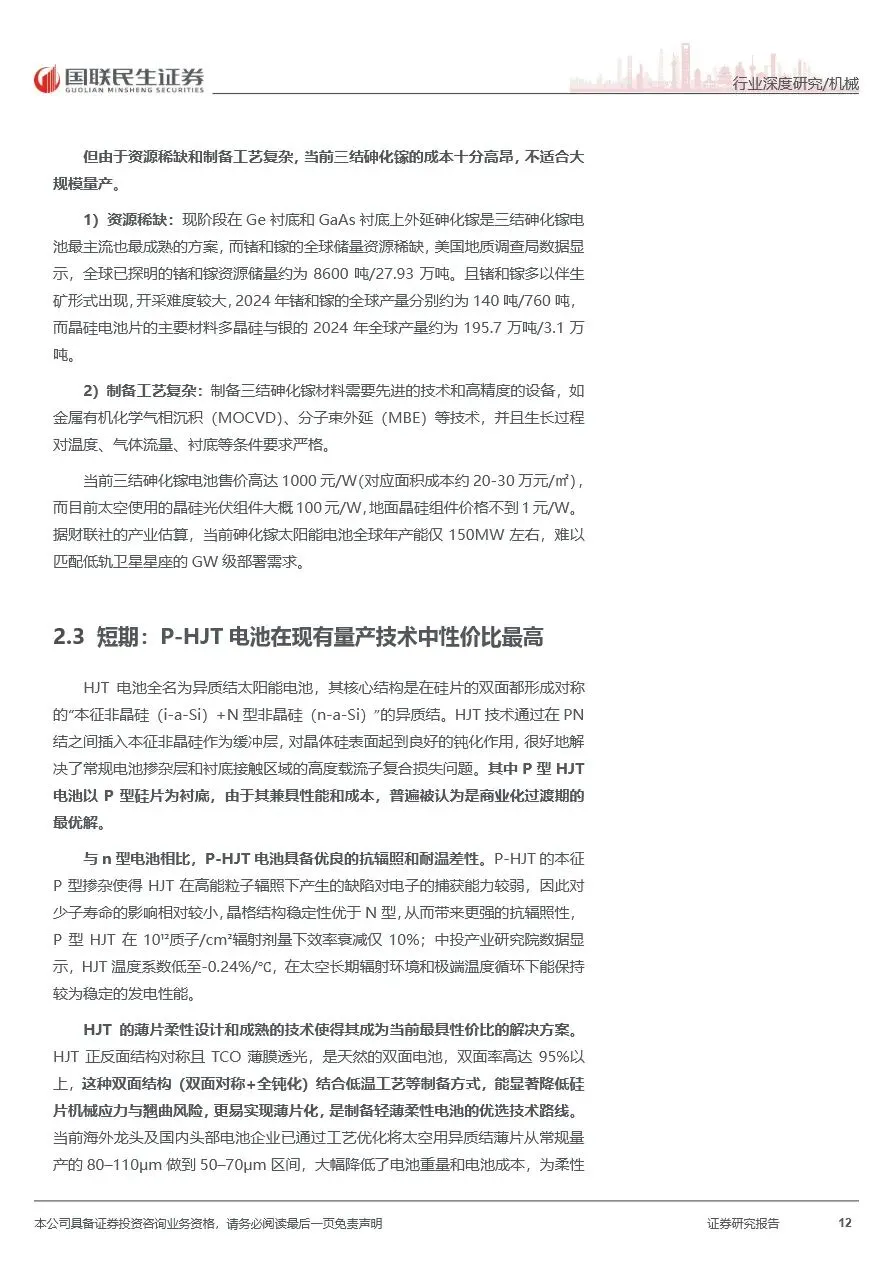 太空光伏技术的发展正经历从三结砷化镓向P-HJT及晶硅/钙钛矿叠层的深刻变革。三结砷化镓电池虽高效、抗辐照,但成本高昂限制了其大规模应用。相比之下,P-HJT电池以其显著的成本优势和良好的抗辐照性能,成为当前最具性价比的解决方案,并已开始在商业航天领域得到小批量应用。而晶硅/钙钛矿叠层技术则结合了高效率与低成本的优势,尽管目前仍处于技术验证阶段,但其未来发展潜力巨大。面对这一技术变革,投资者应聚焦SpaceX产业链,重点关注HJT电池整线设备、组件设备、电池激光加工设备及电池片核心工艺设备等领域的龙头企业。同时,需警惕政策审批落地不及预期、航天产业链配套能力不足及核心技术攻关存在不确定性等风险,以制定合理的投资策略。