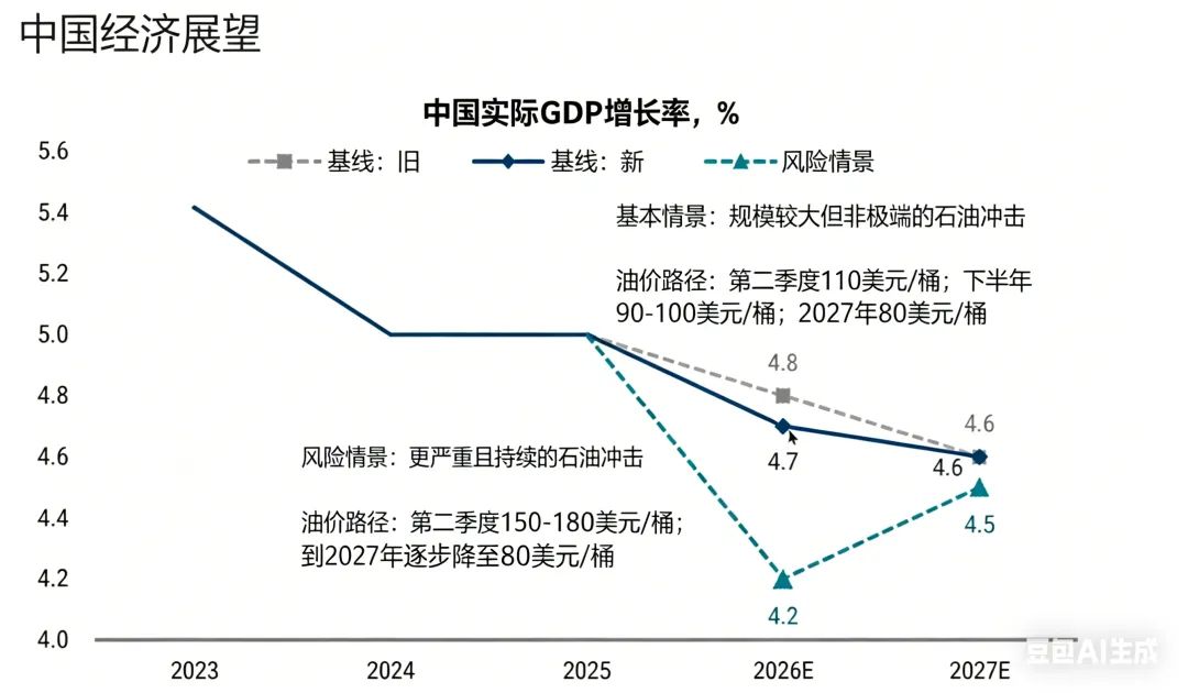 假设霍尔木兹海峡在4月底前恢复正常通航,油价在二季度维持在110美元/桶的高位,随后逐步回落。在此情形下,大摩将中国2026年实际GDP增速预期从4.8%微幅下调0.1个百分点至4.7%。这一调整幅度在亚洲所有经济体中是最小的,凸显了中国经济的相对稳健性。全年走势将呈现“两头高、中间低”的态势,二季度增速或回落至4.5%,下半年有望回升。