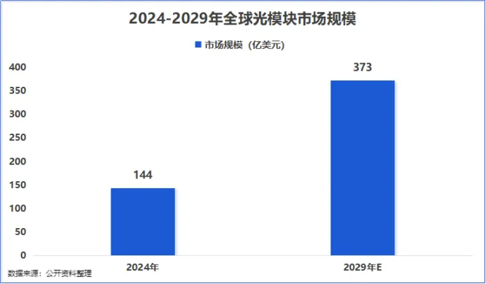 2024年起,受益于全球AI算力投资加强,数据通信类产品市场需求空前旺盛。据预测,2029年光模块市场规模将达到373亿美元,2024-2029年的年均复合增长率高达20%。