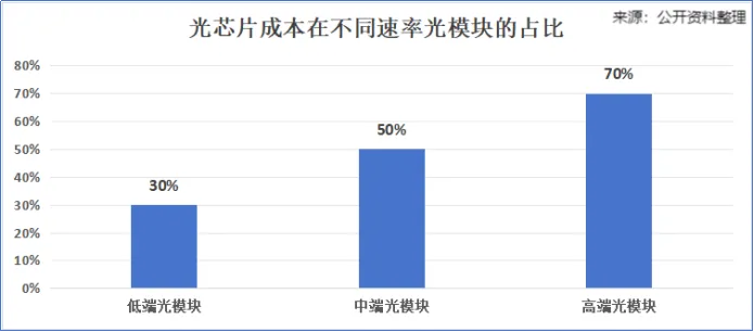 光模块的主要升级方向是加快传输速率。因此,速率越高的光模块中,光芯片的价值占比就会越高。在高端光模块中,光芯片的成本占比可达到70%。
