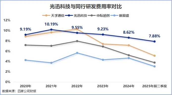 2020年以来,光迅科技每年都拿出超5亿元用于研发,研发费用率维持在8%以上,明显领先于中际旭创、新易盛等同行。
