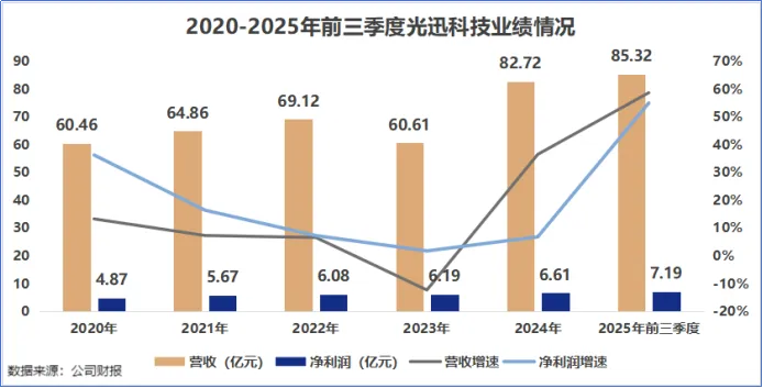 2025年前三季度,光迅科技业绩迎来全面爆发,实现营收85.32亿元,同比增长58.65%;净利润7.19亿元,同比增长54.95%,仅三个季度的业绩便已全面超越2024年全年水平。