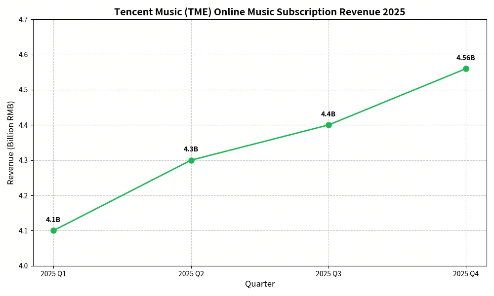 腾讯音乐的在线音乐服务,尤其是订阅盘子,是其市值神话的最后防线。2025年,在线音乐订阅收入同比增长16.0%达到176.6亿元人民币,这可能是目前市场上最让老手感到安心的存量收益。第四季度,订阅收入冲到45.6亿元,同比增长13.2%,稳态仍在延续。如下图所示,即便在全球大环境波动的当下,其订阅收入依然像抽水泵一样逐季攀升,展现了极其硬核的用户付费韧性。注:数据来源于腾讯音乐2025年Q2、Q3、Q4财报,单位为十亿人民币。付费用户数(量):2025年Q4同比增长5.3%,达到1.274亿。单个付费用户月均收入(价):ARPPU同比增长7.2%至11.9元,SVIP用户数已突破2000万,显示出高端用户强大的付费意愿。但裂缝已现。活跃用户数从5.56亿缩至5.28亿,流量池在干涸。更让资本市场炸裂的是,官方决定“封印”数据——不再透露活跃用户详情。这种在信心关口选择黑箱化的举动,无异于在火药桶边点火,直接成了“杀估值”的血腥导火索。二、 版权高墙背后的突围与非订阅业务的“蒙面狂奔”