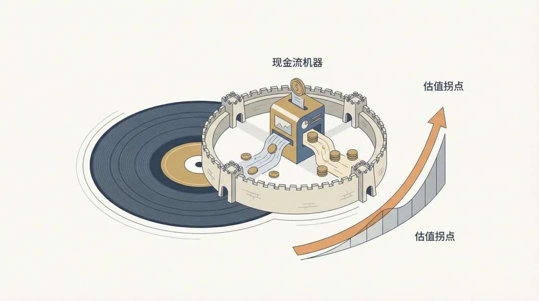 长期以来,TME靠版权构筑了深厚的高墙。但在如今的丛林里,高墙并不绝对安全。汽水音乐带头搞奇袭,用“神曲”路径在侧翼包抄。更麻烦的是,生成式技术的爆发让传统版权的护城河遭遇了前所未有的稀释压力。概念图:版权构筑的护城河是TME价值的核心,但需要市场进行价值重估。在订阅城池之外,以广告、演艺为首的非订阅业务,成了那支“蒙面骑兵”。2025年该部分收入飙升至90.7亿元,增速狂飙近40%。虽然爆发力惊人,但这种波动极大的业务对追求确定性的长线资金来说,更像是一场赌局。优点:高增速,有效拉动整体营收,打开了新的变现空间。缺点:波动性大、可预测性差。资本市场对这类收入给予的估值倍数远低于稳定、可复利的订阅收入。现在的TME,讲的不再是单纯的收租故事,而是在向“稳健收割+机会主义”的混合体变异。这种模糊感让估值模型变得棘手,资本老猎手往往会先给模糊的东西打个对折。三、 估值猎杀与捕猎逻辑:当确定性归零,黄金坑在何处?