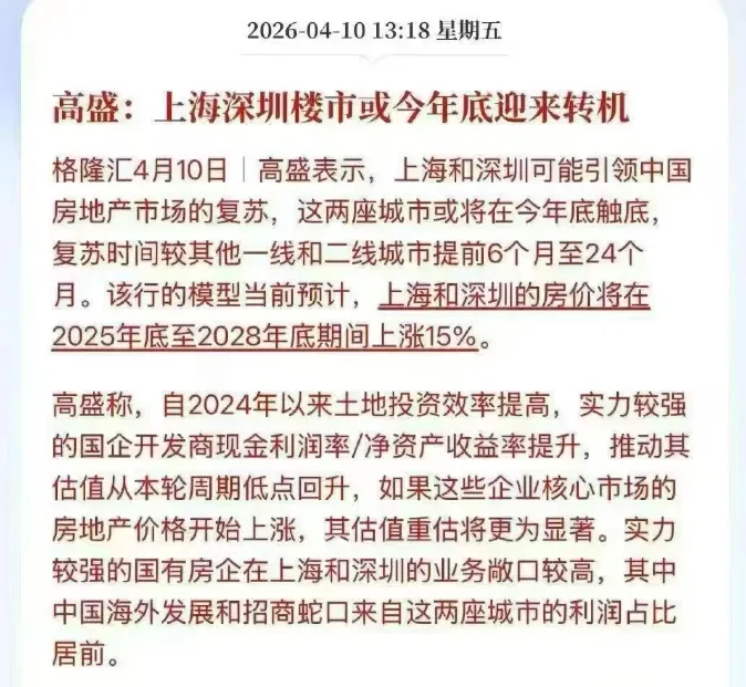 高盛研报:香港复苏,上海,深圳楼市或今年迎来转机!预测将上涨15%