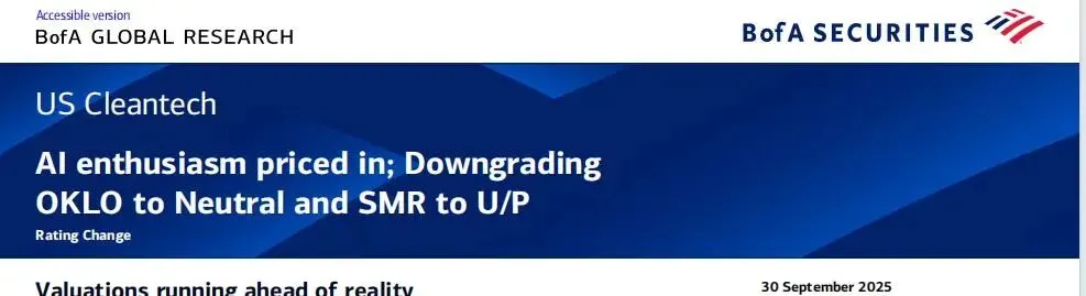 Oklo年内涨449%,NuScale涨113%,四大云厂商资本开支翻倍,数据中心抢电故事讲得天花乱坠——但美银在9月30日直接给市场浇了盆冰水:AI带来的核能题材已充分反映在股价中,估值过高。更扎心的是,Oklo创始人在研报发布前已经出售股份。