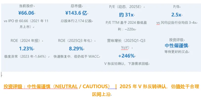 P/E(动态) | 倍数 | 风电设备20-35x | 约31x(2025E EPS约2.12) | 基本合理,处于行业区间上沿 |